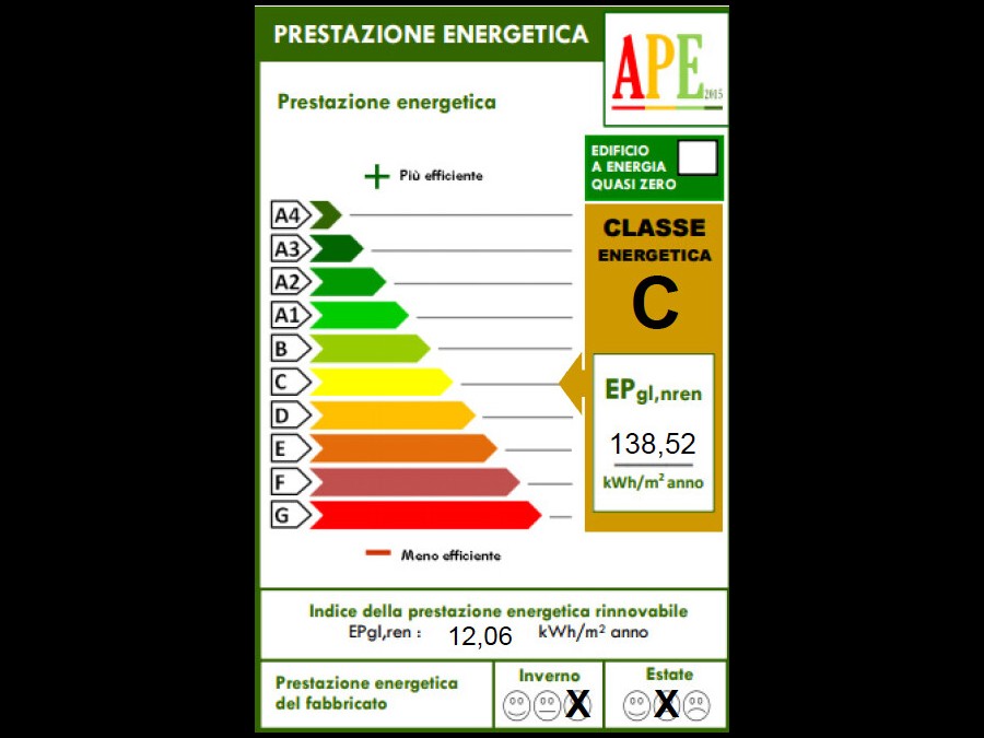 Classe energetica C, EPgl,nren 138,52 kWh/mq anno, EPgl,ren 12,06 kWh/mq anno.