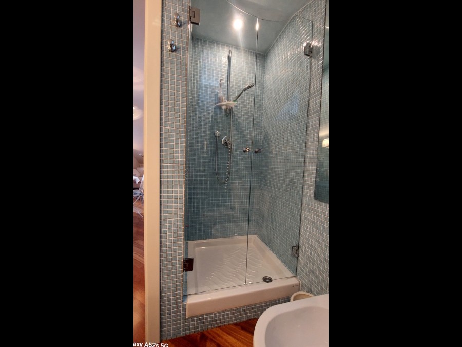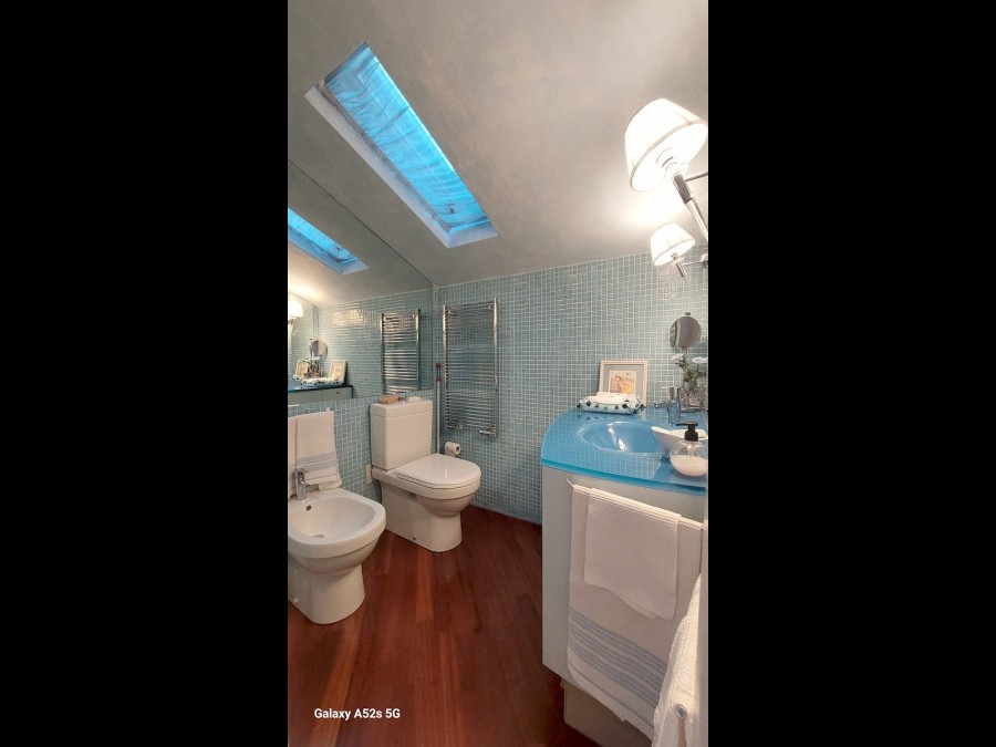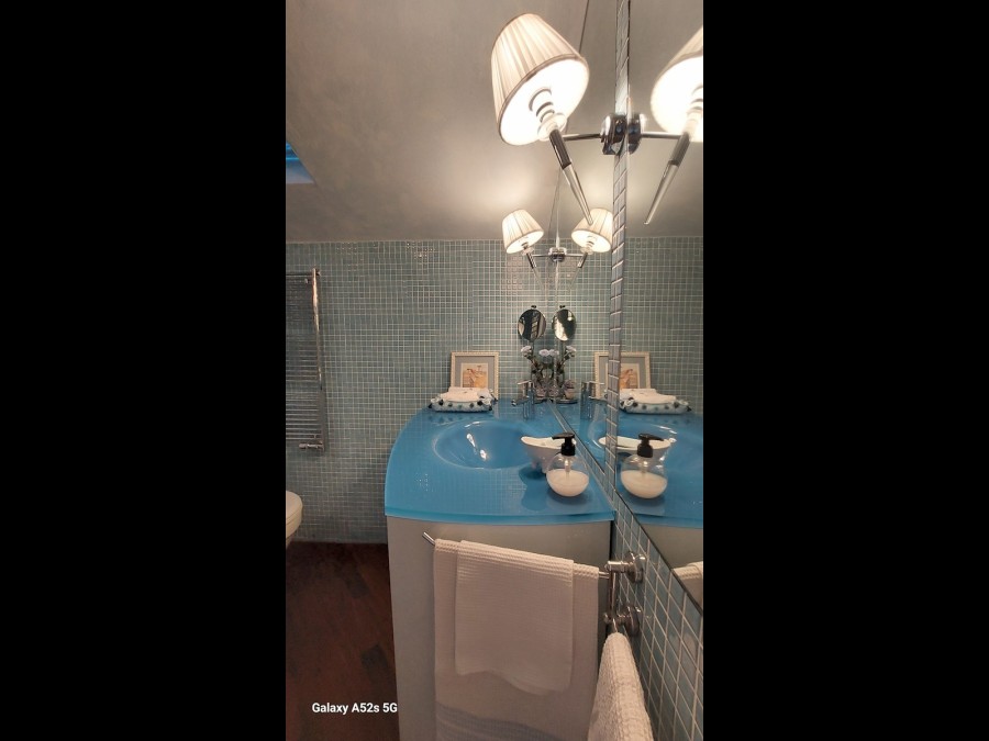 Il bagno di design, rivestito in moderni mosaici e inondato di luce naturale grazie a un lucernario completo di zanzariera, è curato in ogni dettaglio: completo di sanitari, doccia e un ampio lavabo in vetro.