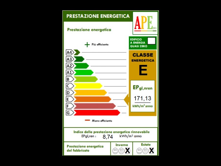Classe energetica E, EPgl,nren 171,13 kWh/mq anno, EPgl,ren 8,74 kWh/mq anno.