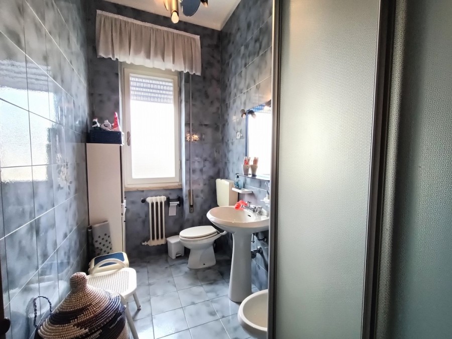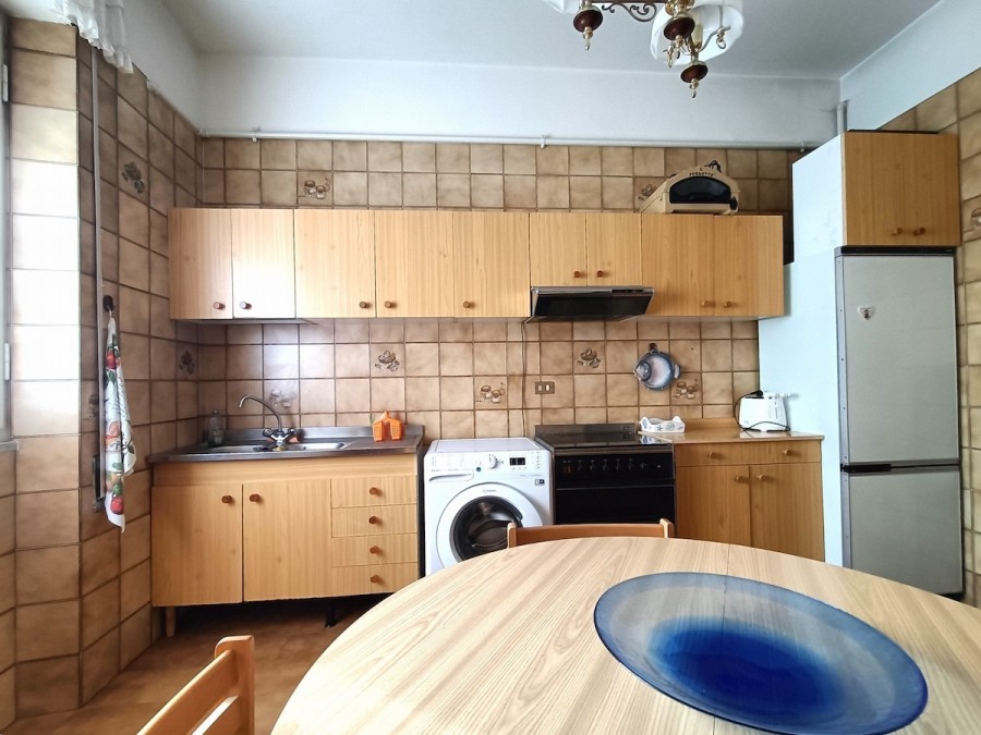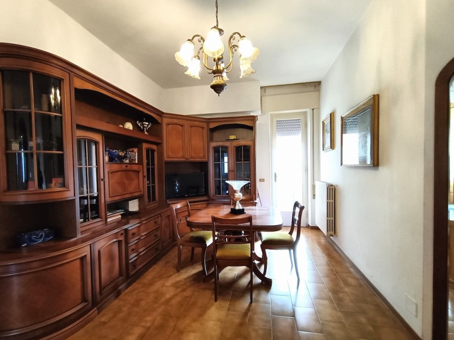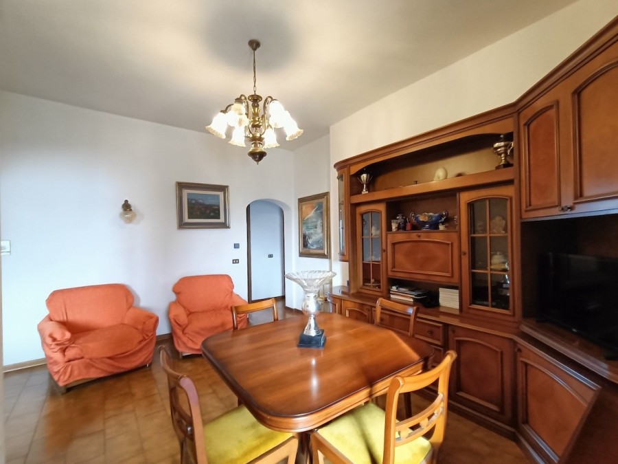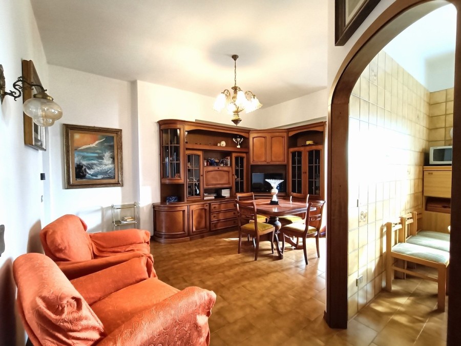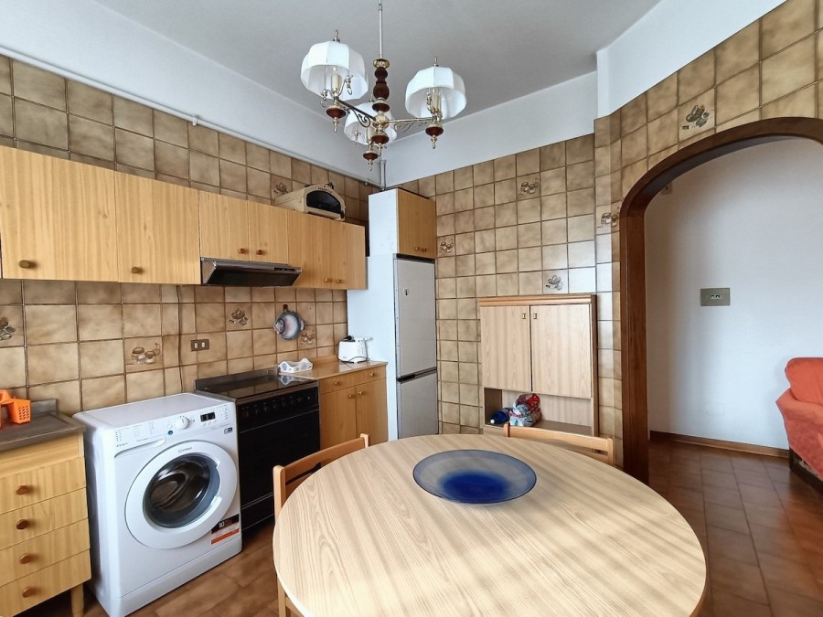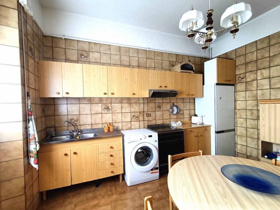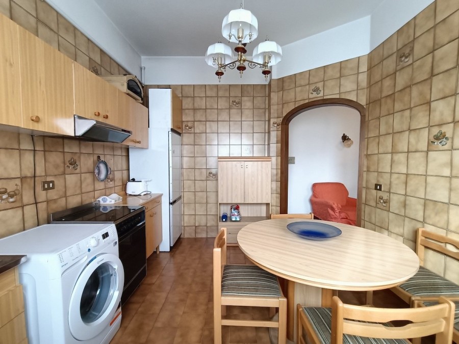 Appena varcata la porta di ingresso ci troviamo nella bella sala con balcone lato sud e con adiacente la grande cucina abitabile (circa 11 mq).