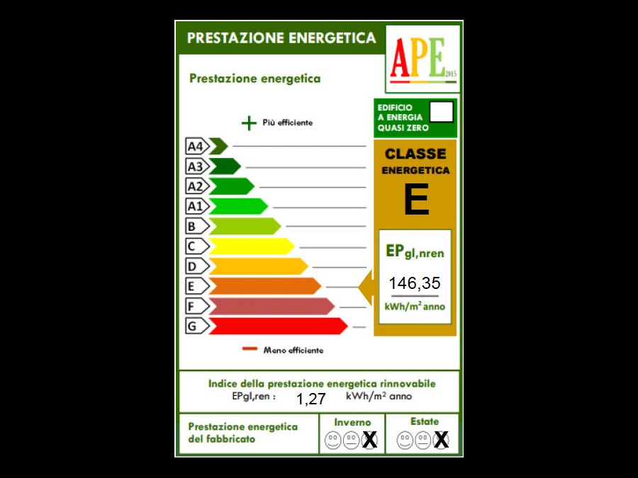 Classe energetica E, EPgl,nren 146,35 kWh/mq anno, EPgl,ren 1,27 kWh/mq anno.